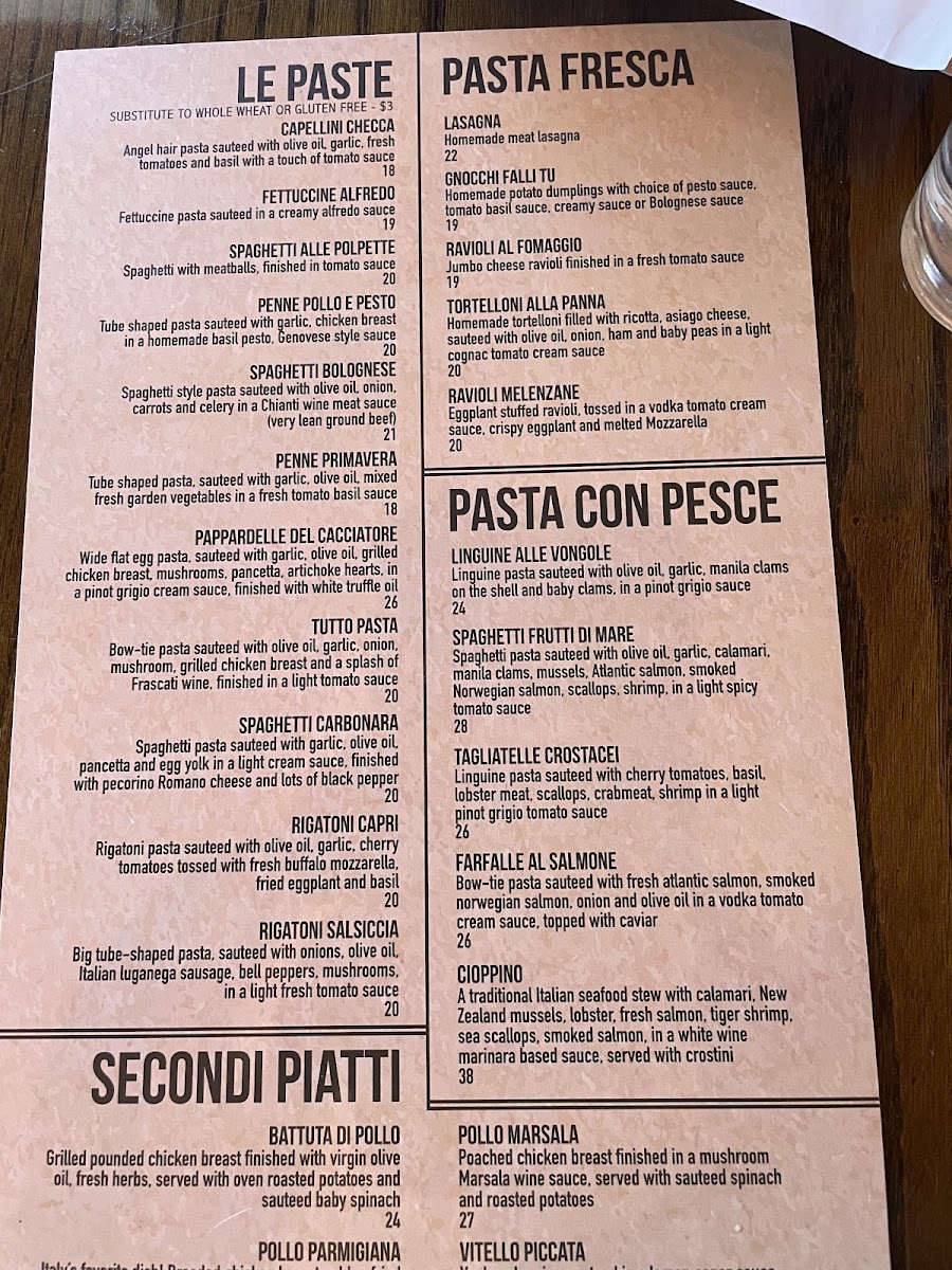 Angel hair pasta, sautéed with olive oil, garlic, fresh tomato and basil, with a touch of tomato sauce.